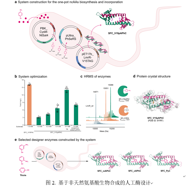 本研究通过整合S-芳香基半胱氨酸生物合成系统、兼容的正交翻译系统和目标蛋白质表达系统,创建了用于原位生物合成非天然氨基酸的人工酶。作者通过将三个质粒(分别编码工程化CysM、OTS和LmrR整合到大肠杆菌中,构建了人工酶表达系统。作者只需在培养基中添加ncAA前体底物,细胞工厂便可自动产生含有pAPhC残基的人工酶SFC_pAPhC。通过进一步优化细胞生长条件(如培养基、温度和前体浓度),SFC_V15pAPhC的表达水平提升至14 mg/L。为验证该系统的兼容性,作者成功构建了含非天然mAPhC、oAPhC和PyC的多种含硫醇类ncAA人工酶。这些结果表明,该体系提供了一种高效便捷的人工酶设计策略,并在建立多样化人工酶库方面展现出巨大潜力(图2)。