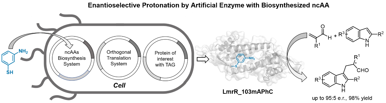 此研究通过将非天然氨基酸原位生物合成与遗传整合相结合,为人工酶设计提供了更直接、经济的新路径。相较于以往通过直接添加ncAAs的方法,摒弃了传统依赖外部化学合成的路径,显著简化了酶的设计流程。通过将ncAAs精准引入酶的活性位点,显著提升了酶的催化效率,并实现了质子化步骤的高对映选择性调控。本研究结果为非天然氨基酸在拓展人工酶催化多样性方面的潜力提供了有效策略,同时为开发酶催化非天然反应提供了可选择的技术路径。